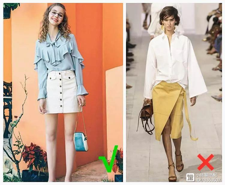 再来组裙装对比照,右图上衣露在下衣外,分界线即为腰线,生生将比例拉成上长下短,没有美感。看左图上衣下摆塞进下装,腰线自然也就提高了,这种穿衣小技巧也会显得整个人更加利落精致。