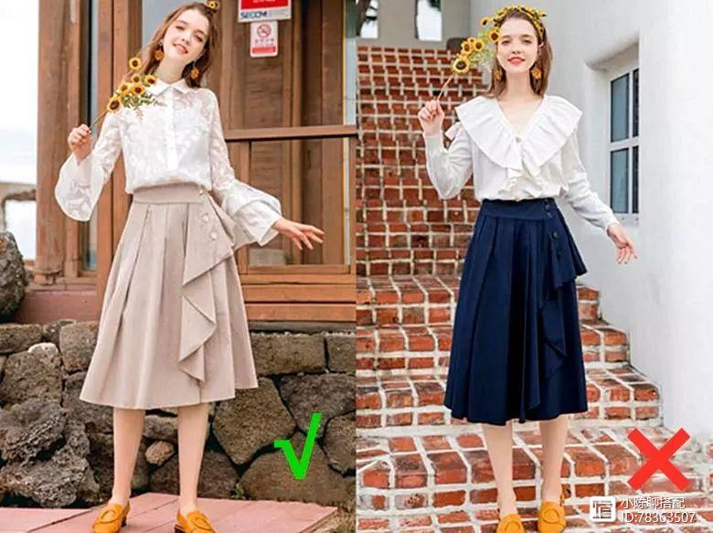 再看一组色彩的对比图,左图选择暖色系和浅色系,对视线的吸引力更强,也会给人膨胀的视觉效果,完美优化臀部,而右图选择选择饱和度和明度较高的暗色系的下装,这样穿搭反而有点不伦不类。