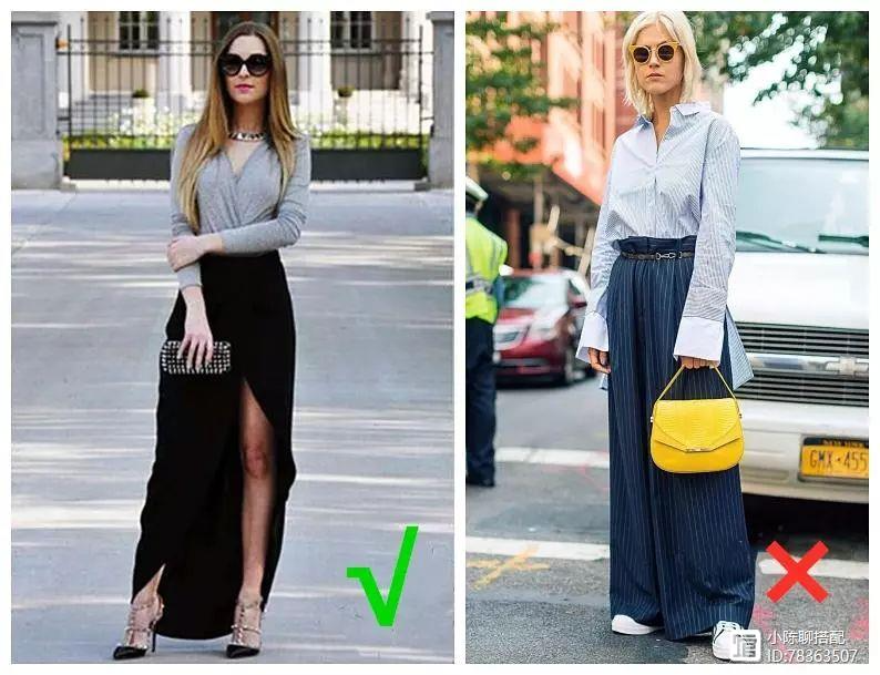 从视觉上来看,拉长腿部线条也是优化全身比例的好方法。左图中淑女风与长长的裙子更配,更显淑女的端庄大方,开衩长裙露出若隐若现的腿部线条更显腿长与性感,右图宽大的直筒裤虽然也能拉长比例,但总是与淑女风不符。