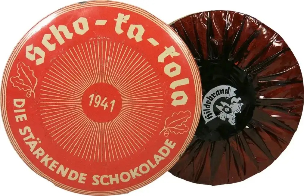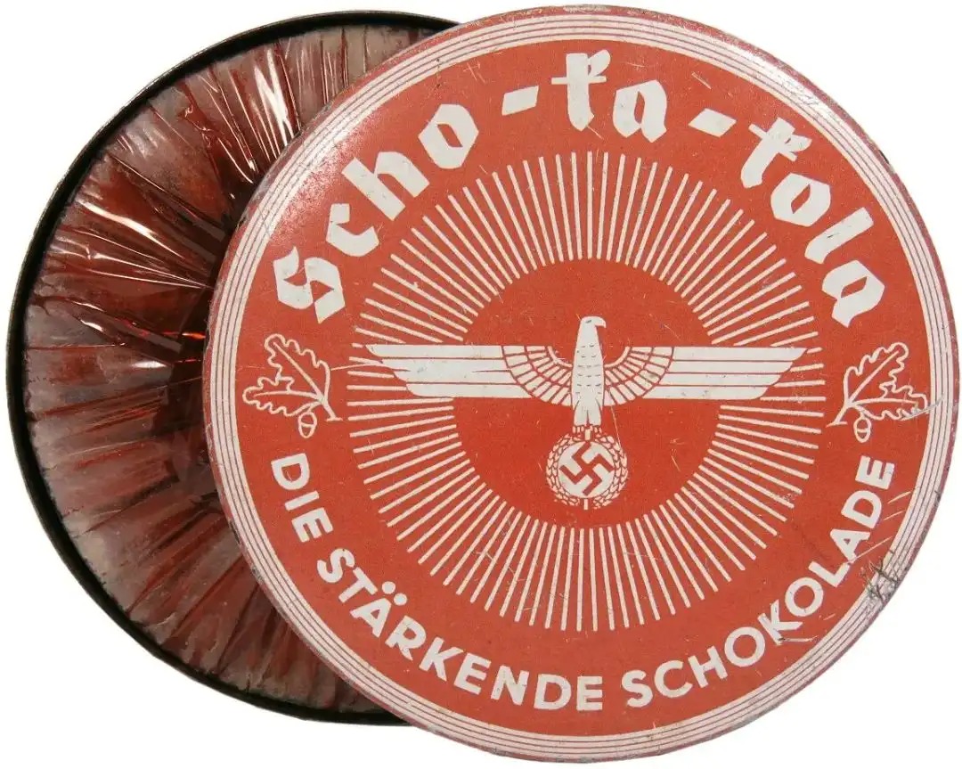 Scho-ka-kola巧克力是德国士兵配备的巧克力牌子,使用圆形铁包装,军用版盒盖上印有“国防军”标识。