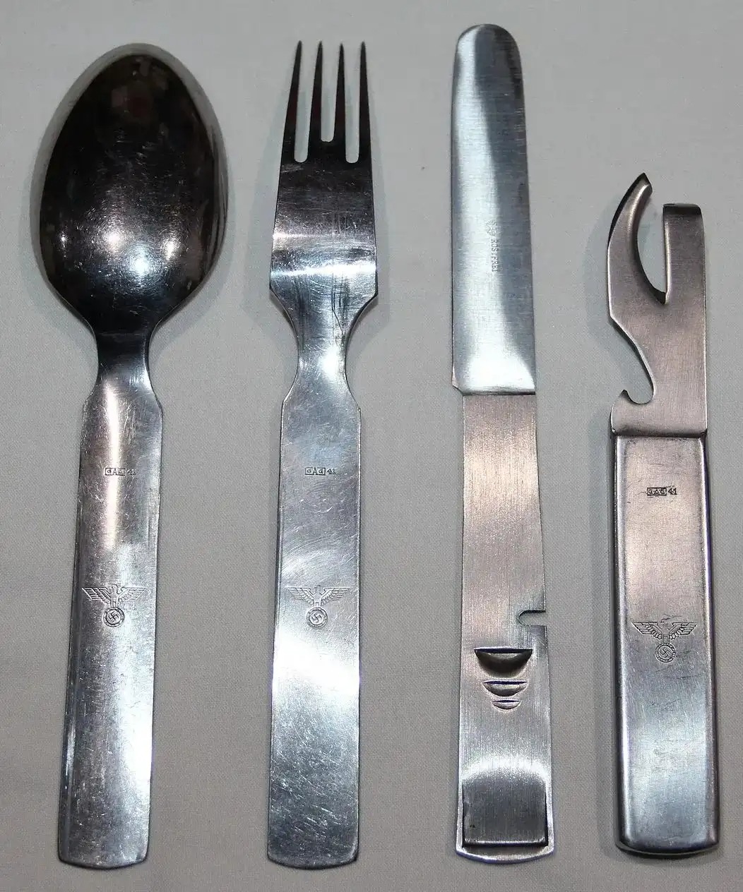 餐具为一套四样,包括勺子,叉子,刀子和起子,平时可以折叠在一起收纳。