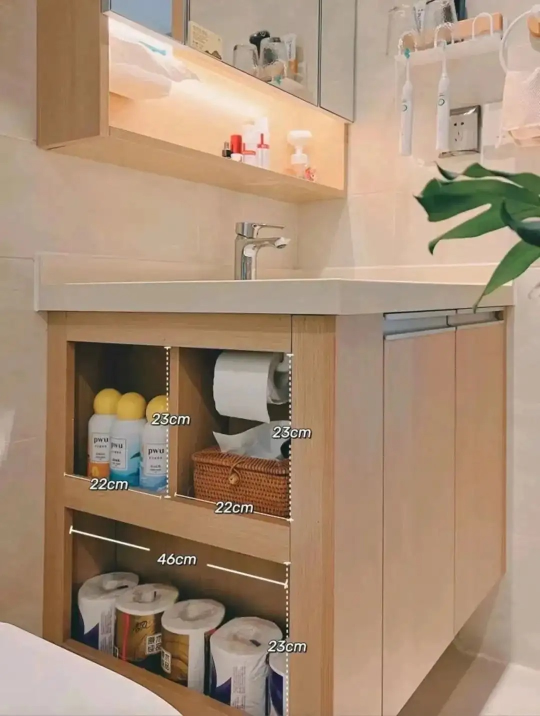 浴室柜最好还是安排上一个大的开放格,可以放常用的护肤品,这样台面就不用放东西,清洁很方便,牙刷/漱口杯/擦手巾都可以上墙,取用和归位都很方便,形成习惯就不会乱放了。