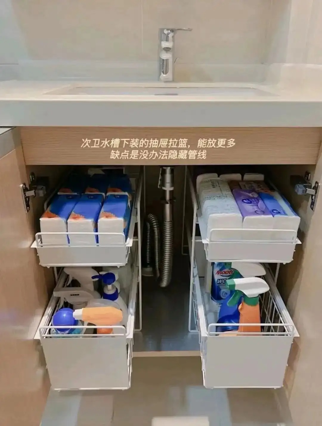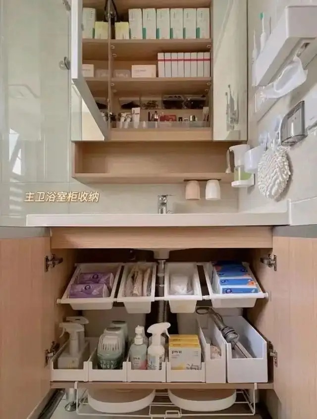 水槽下的收纳也一定要做,可以装抽拉架,能装很多,抽拉拿取也方便,或者直接放收纳盒也可以,具体还是要看收纳什么东西为准了。