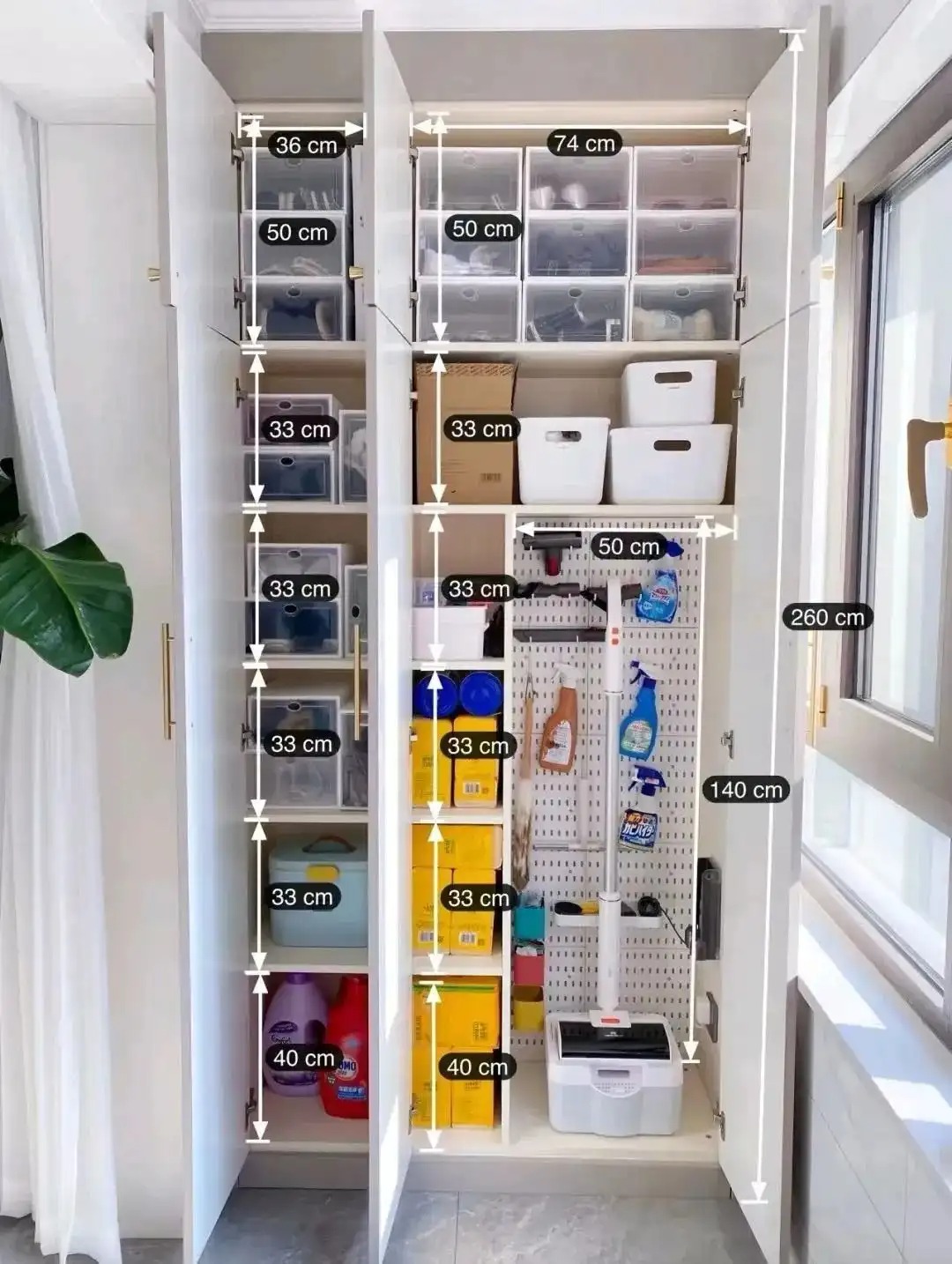 通顶柜是阳台收纳的一大福音,它不仅有很强大的收纳能力,清洁家政柜、清洁纸品收纳等等都可以放进去,而且美观程度也很高。