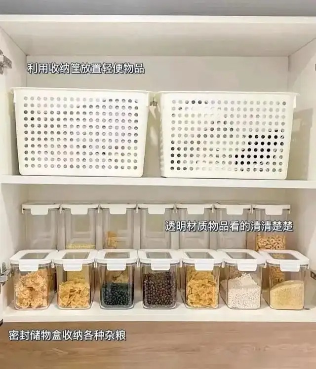 而厨房里的收纳则主要是依靠拉篮,使厨房变得井井有条,三层收纳空间的储物拉篮,最上层可以分格分类放一些其它的厨具餐具,找起来很方便。零食和杂粮干货可以放在下两层的平篮空间,一目了然。