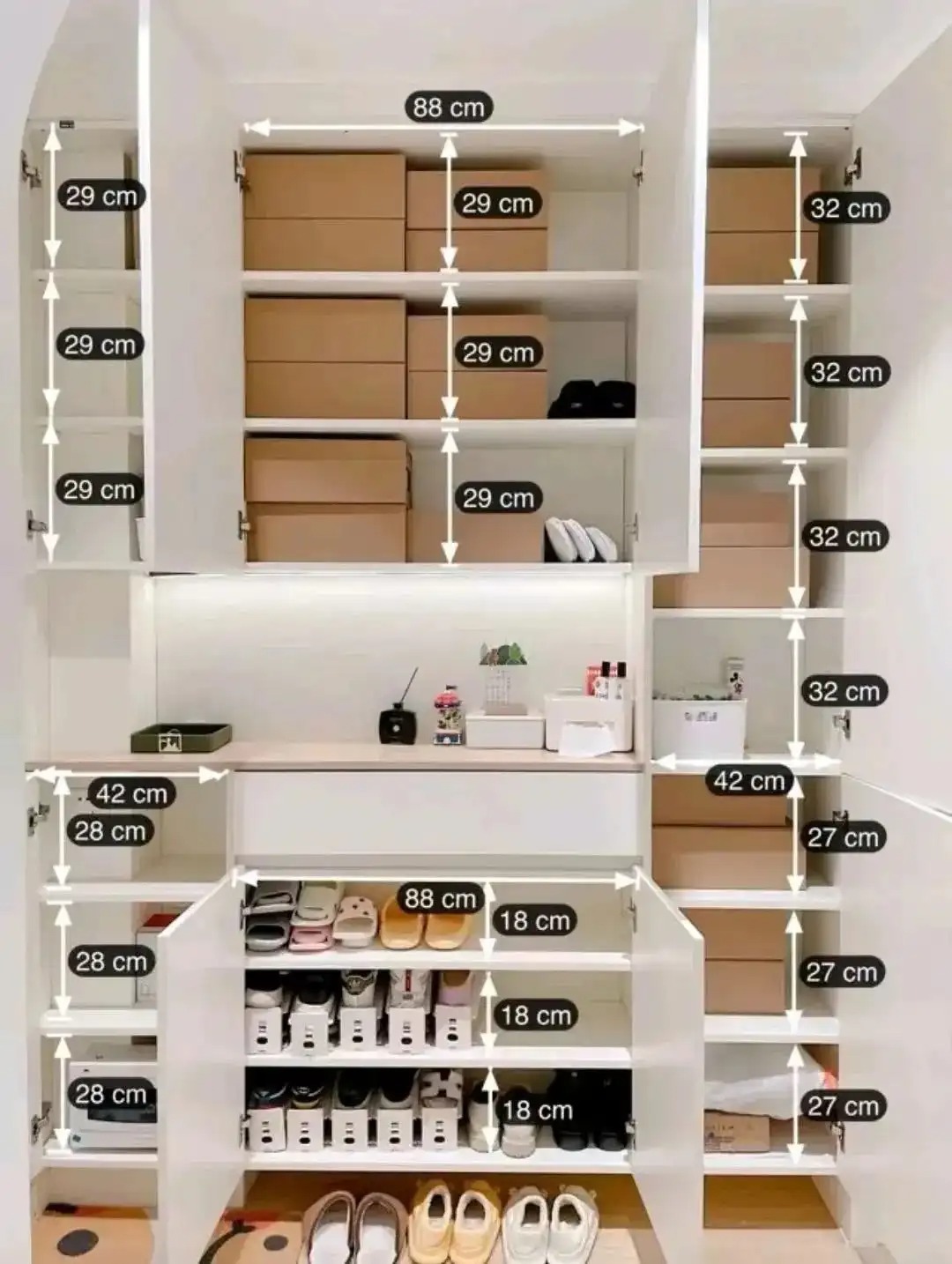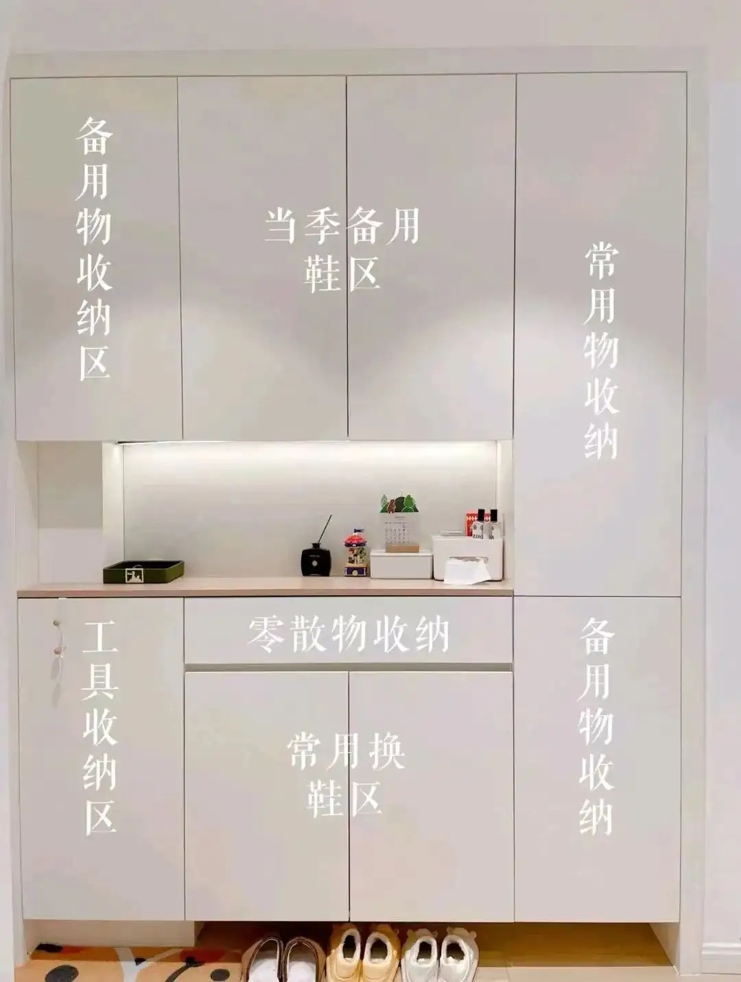 定制一组不大不小的柜子,功能性非常强,它分别承担了:常用鞋收纳、不常用鞋收纳、零散小物品及进门用品存放。