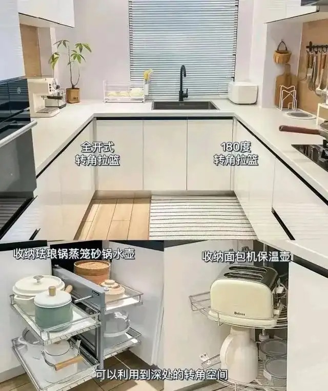 重点是有很多人把橱柜的转角处的空间都白白浪费,因为转角空间比较深,光效比较暗,是收纳的盲区。