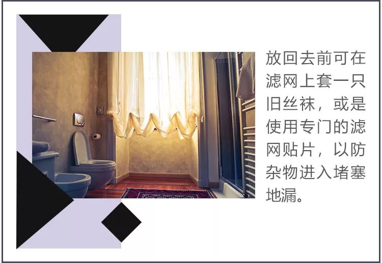 清洁:先用牙签把地漏周围的头发杂物挑出去丢掉,然后将地漏滤网拆下来清洁掉上面缠绕的杂物,放进用温水稀释好的小苏打溶液中浸泡半小时并用旧牙刷洗刷干净。放回去前可在滤网上套一只旧丝袜,或是使用专门的滤网贴片,以防杂物进入堵塞地漏。